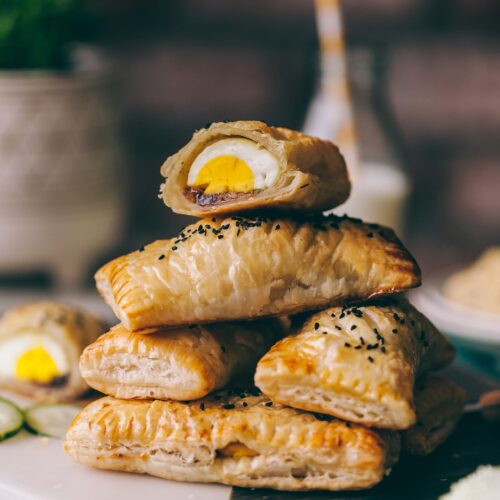 Hardboiled egg, along with caramelized onion, wrapped in flaky puff pastry! It’s a quick snack that is so good with tea especially on a rainy day. You can call these egg turnover or egg puff pockets too. On an indulging weekend, this can be your breakfast too with some cheese and greens and boiled egg inside puff pastry and baked to perfect flaky!